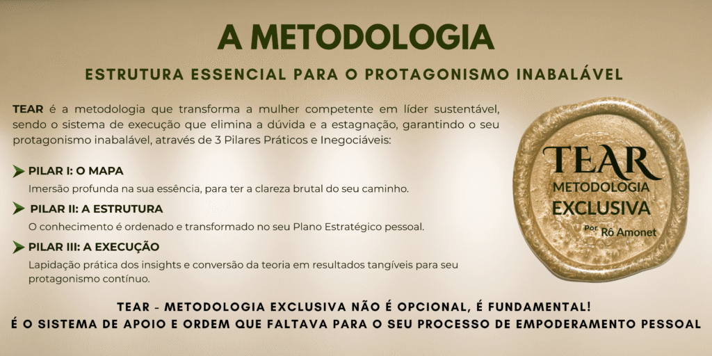 O TEAR (a nossa Metodologia Exclusiva) é o seu sistema de Governança Pessoal. Ele garante que você não apenas “descubra” o que te bloqueia, mas que você crie um Plano de Execução (Pilar III: A Execução) para transformar insights em resultados tangíveis e duradouros, eliminando o risco de estagnação.