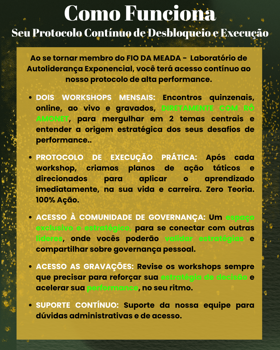 O FIO DA MEADA é um LABORATÓRIO DE AUTOLIDERANÇA EXPONENCIAL. Não é terapia nem autoconhecimento genérico. É um programa de Execução Contínua focado em aplicar o Protocolo TEAR de Governança Interna para eliminar a dúvida paralisante e traduzir sua sabedoria em decisões assertivas e resultados de alto impacto na carreira.